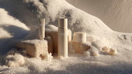 Cozy winter scene with skincare products and miniature pine trees on snow