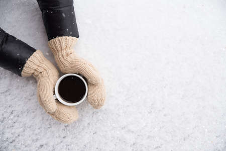 Female hands in woolen knitted gloves holding cup of warm black coffee outdoors on snowy background. Top view of hands and coffee mug