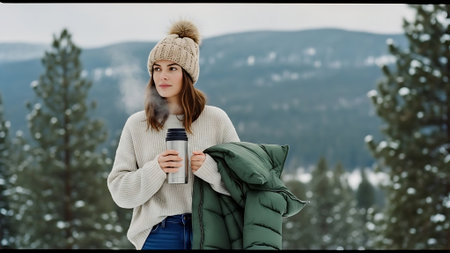 A beautiful girl in a gray jacket and knitted white mittens is drinking a drink in a snowy forest. Comfort and warmth in the winter season. selective focus.