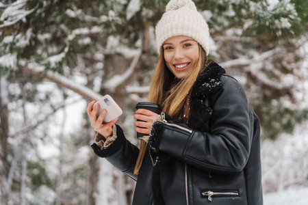 Happy girl using cellphone and drinking coffee takeaway while walking in winter forest