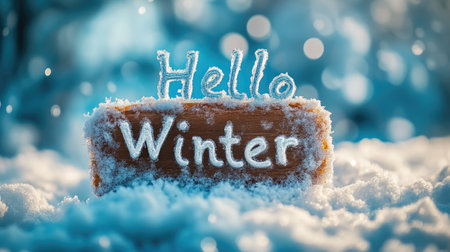 Board with winter text outdoors on snowy background