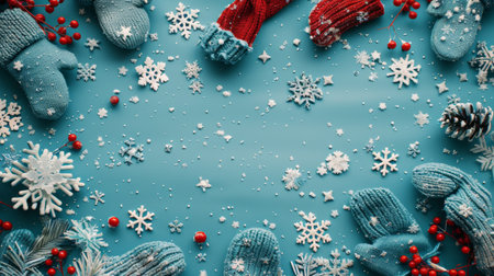 Winter Holiday Background with Mittens, Snowflakes, Pinecones, Berries, and Festive Decor