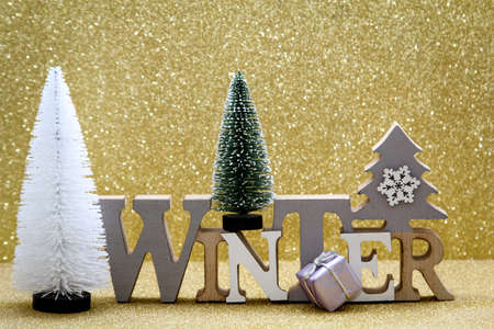 Text winter on snow surface in cold night time lighten by warm orange light. Winter season and snowfall concept.