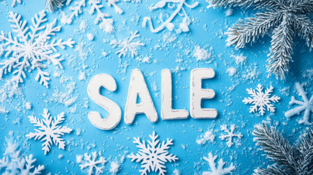 Winter sale sign with snowflakes and frosted pine branches on blue background, festive holiday shopping concept