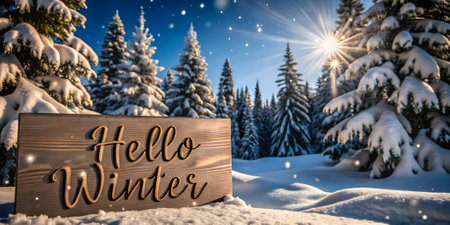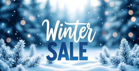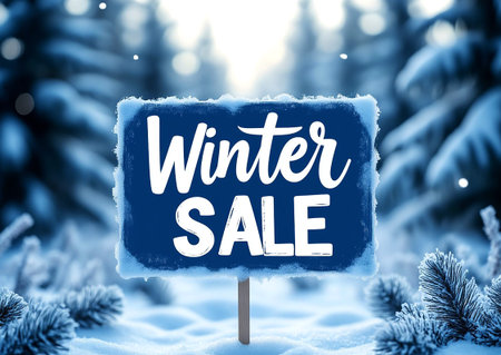Winter Sale Sign in Snowy Forest with Frost and Pine Branches. Festive Blue Background with Glowing Bokeh and Elegant Text.