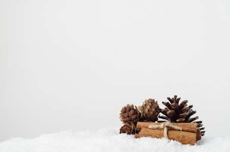 Natural Christmas decorations. Fir cones and cinnamon stick bundle on artificial snow with copy space above.