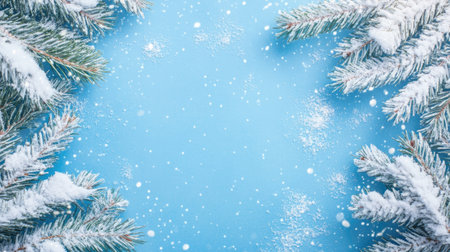 A beautiful arrangement of frosted evergreen branches creates a serene frame around a blank space, ideal for winter designs, holidays, and seasonal greetings.