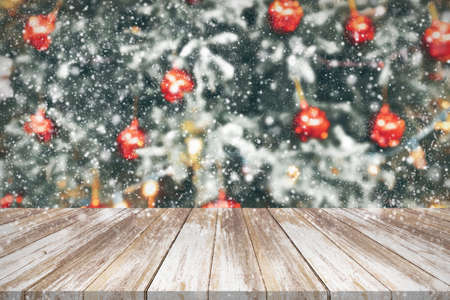 Beautiful winter scene. blurred background of snowy christmas nature background, Wood table top on shiny bokeh. For product display Christmas time mock up