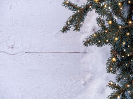 Christmas white wooden background with fir branches and glowing lights garlands. Snow in the background and spruce branches. A place for a text, a Christmas card.