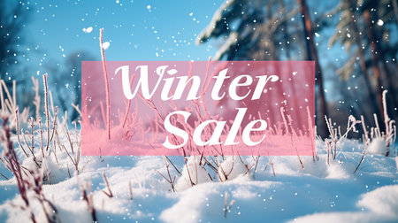 A cozy, winter-themed background with snowflakes, gift boxes, and “Winter Sale†signs, all set against a soft, snowy landscape.
