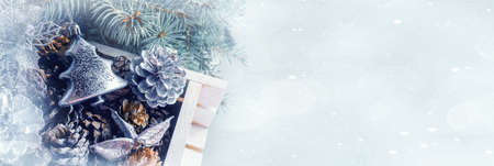 Decorative wooden box with Christmas tree toys and gift boxes. Silver toys with cones and shiny gift boxes. Christmas card with a copy space.
