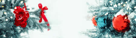 Bright Christmas banner. Christmas tree balls and red roses to decorate the Christmas tree. Snow and bokeh on the Christmas banner. copy space