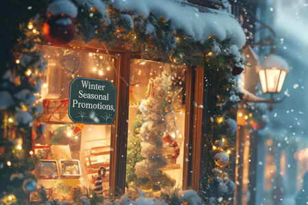 A cozy storefront glows under the charm of twinkling lights, highlighting seasonal promotions. Snow falls gently, creating a picturesque winter atmosphere with a decorated tree visible inside.