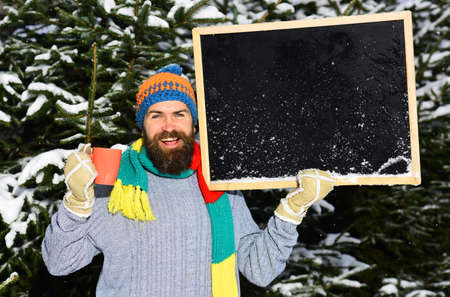 Macho with beard holds cup and blackboard with frost on
