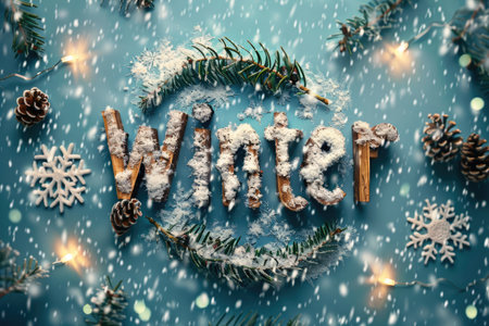 Word Winter on the snow surrounded by fir tree twigs, cones and lights on bokeh background. Christmas and New Year theme.