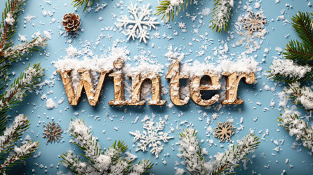 Word Winter on the snow surrounded by fir tree twigs and cones. Christmas and New Year seasonal theme.