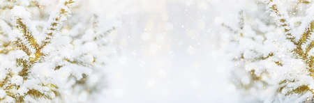 Christmas festive background. Fluffy spruce branches in snow winter landscape. Mock up for postcard copy space banner