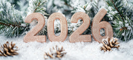Wooden numbers 2026 surrounded by snow and pine cones on a winter background, celebrating the new year and winter season concept.