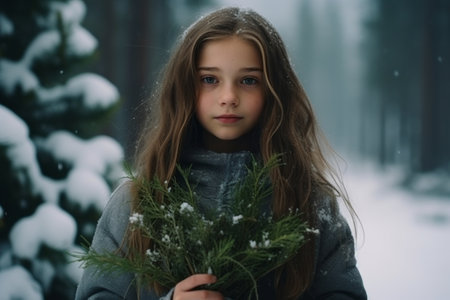 This captivating winter portrait features a close-up of a persons face surrounded by frosty plants, evoking a serene and chilly atmosphere, perfect for seasonal themes.