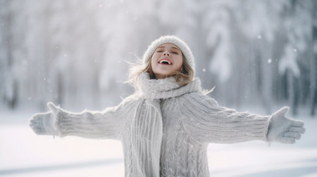 Young woman is enjoying a beautiful day in the forest while snowflakes are softly falling on her face