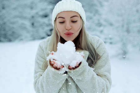 Beautiful girl in fashionable winter clothes blows snow from the palms of her hands. Joy to the first snow .Young blonde in a white hat in a snowy forest