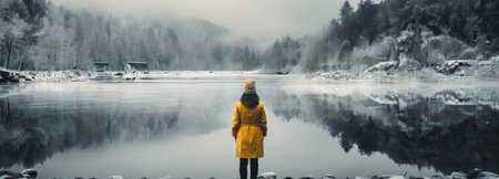 Snow covered spruce trees line a tranquil lake, their frosted branches perfectly reflected in the calm, dark blue water. a misty winter landscape creates a serene and peaceful natural scene.