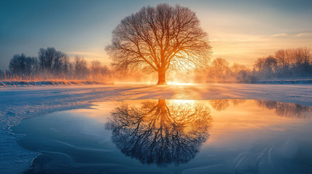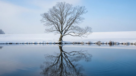 This stunning winter landscape captures a lonely tree reflecting in still water, creating a peaceful and serene scene perfect for nature lovers.