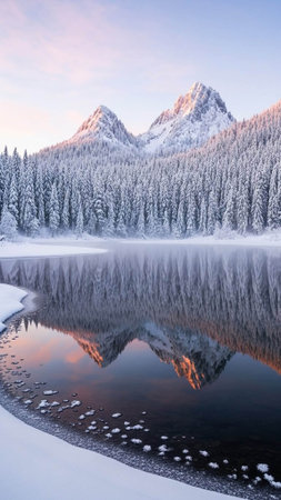 A tranquil winter scene of a pristine lake mirroring snow-covered mountains and a frosty forest.