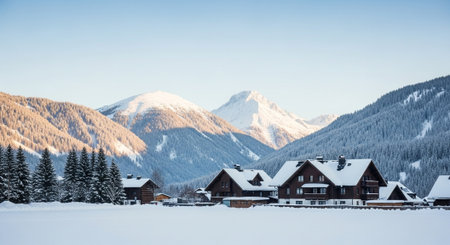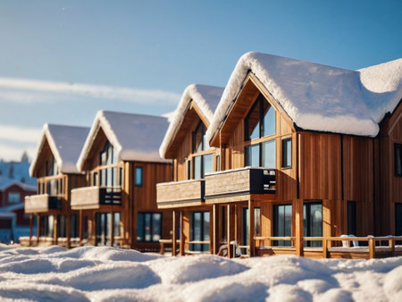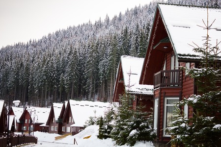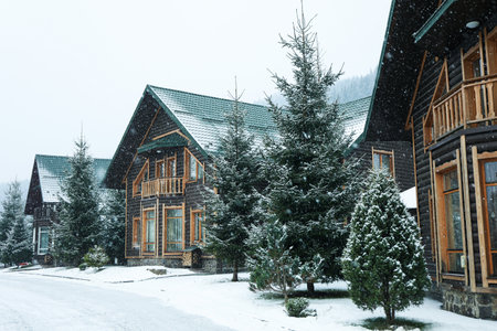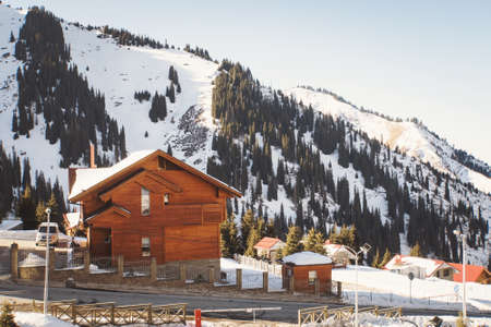 Cozy wooden cabins cottages houses in chalet style covered in snow near ski resort in winter. Beautiful Alpine village in snowy mountains. Xmas scenic background.
