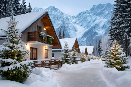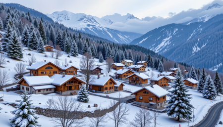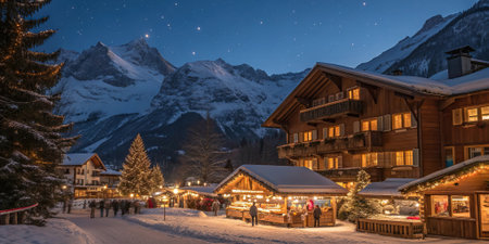 Cozy chalets and illuminated Christmas trees create a festive winter scene with mountains