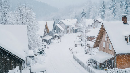 beautiful winter landscape with wooden houses and snowfall in the mountains