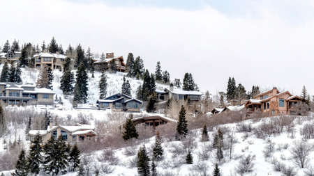 Panorama Scenic mountain in Park City Utah with houses and trees amid fresh winter snow. Vast cloudy sky can be seen over the residential and nature scenery.