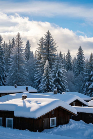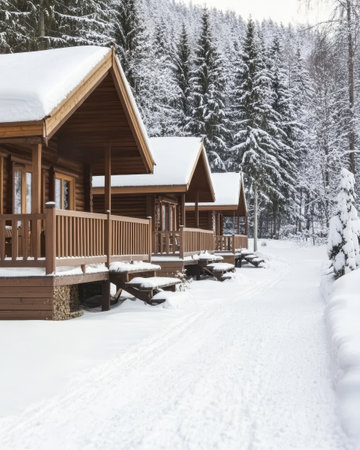 Wooden cabins are lined up in a snowy forest surrounded by tall evergreen trees. The ground is blanketed in white snow creating a serene winter atmosphere.