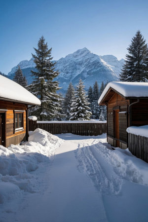 Isolated chalet, snow, pines charming mountainous scene., generative AI