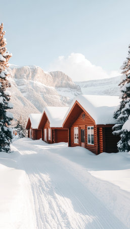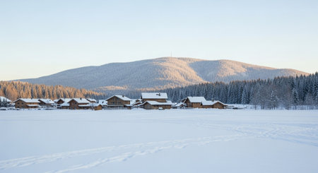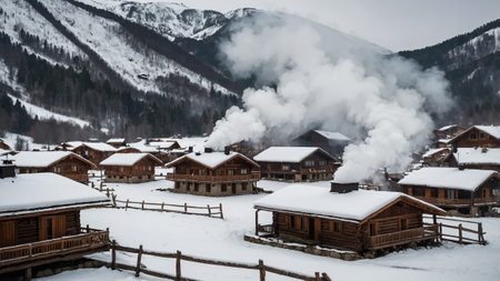 Winter landscape features quaint wooden cabins surrounded by mountains and snow, with smoke rising from chimneys in a peaceful rural setting