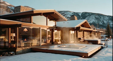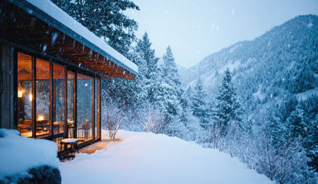 A Modern mountain lodge with panoramic glass walls and cozy ambiance