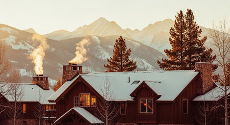 Beautiful alpine landscape with wooden houses and smoking chimneys.