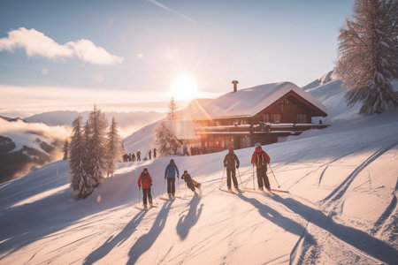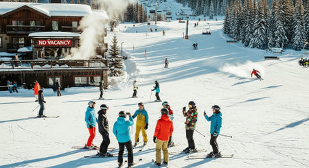 winter sports resort, with skiers and snowboarders enjoying the slopes, created with generative ai