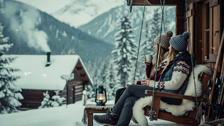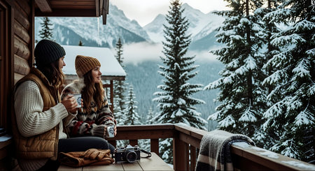 Two young women in warm clothes sitting on the terrace of a mountain house and drinking tea