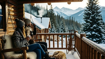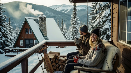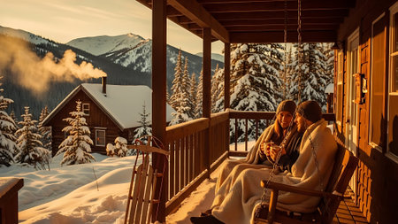 Couple sitting on a porch in the mountains and drinking hot chocolate