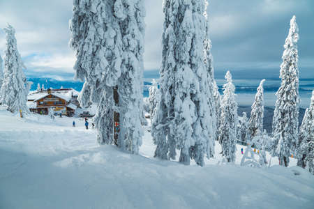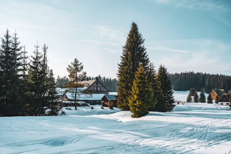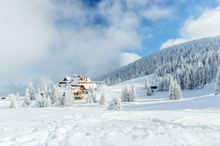 Amazing winter landscape with cute mountain chalet and picturesque snow covered pine trees, Carpathians, Romania, Europe