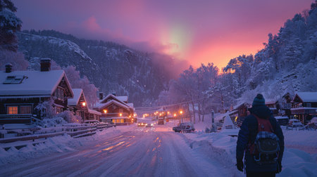 A Scenic Snowy Cabin Village Illuminated at Twilight by Stunning Northern Lights