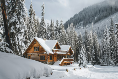 forest lodge nestled among evergreen trees blanketed in snow, created with generative ai