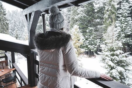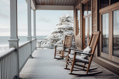 cozy wooden chairs on terrace of country house in winter forest and drinking hot tea, early evening, warm light from large window, enjoying winter nature