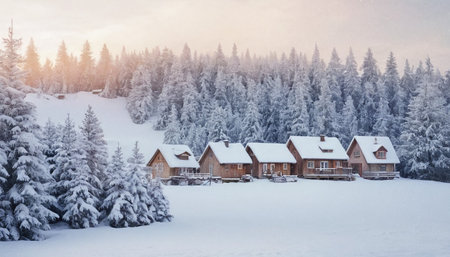 Wooden cabins stand in a snow-covered forest bathed in the warm, golden light of sunrise, creating a tranquil winter scene.