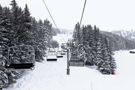 chair lift in ski center les arcs, paradiski on the french alps on a winter snowy day