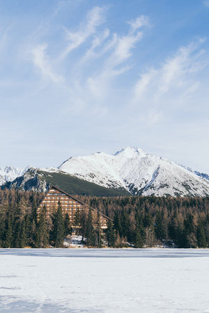 Strbske Pleso, Slovakia - December 2019: view over Patria hotel and High Tatra mountains above frozen lake.