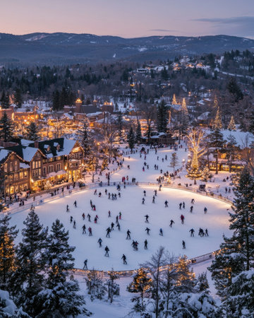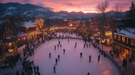 Experience the magic of winter at a mountain resort, where people of all ages enjoy ice skating together under the vibrant pink and purple hues of a setting sun.