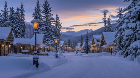 A serene winter scene a small village nestled in a snowy mountain valley. Illuminated Christmas trees, one with a star on dot the landscape. Wooden cabins with warm lights emanating from windows are scattered throughout the village. Snow covers the ground and the roofs of the houses. In the background, snow-capped mountains rise against a twilight sky with soft orange and yellow hues. A frozen lake or river is visible in the distance, surrounded by dense pine forests.