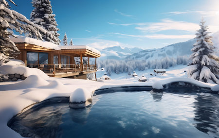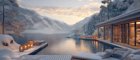 Charming lakeside house surrounded by a tranquil, snowy forest landscape in winter wonderland